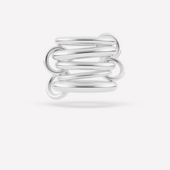 The Aquarius ring was the first Spinelli Kilcollin design, and it continues to inspire a fervent following with its substantial, multi-gauged design and the stunning fluidity of its sterling silver construction. Its linked bands are commonly worn across several fingers to fully display its spirit of movement and tactility. The Aquarius ring can be customized in shades of 18k gold and sterling silver, and is individually handmade in Los Angeles.