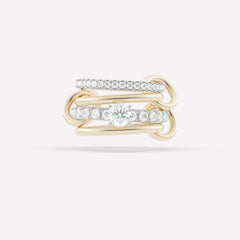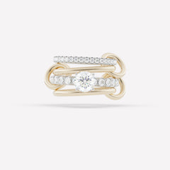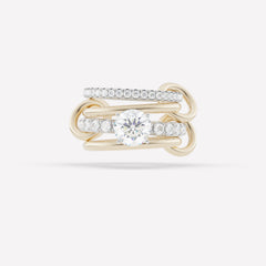 The Blythe displays a multi-gauged design featuring a balance of solid metal and pavé-set bands of 18k white gold, contrasted by orbiting connectors in 18k yellow gold that add tonal warmth. Each eternity band is pavé-set with hand-selected white diamonds that represent an everlasting partnership, highlighted by a central solitaire stone of your choice. In support of every kind of love, each Blythe is fully customizable and handmade in Los Angeles.