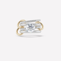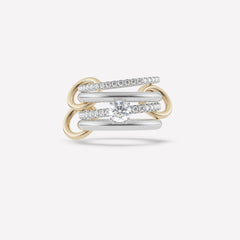 The Cora displays a multi-gauged design featuring a balance of solid metal and pavé-set bands of 18k white gold, contrasted by orbiting connectors in 18k yellow gold that add tonal warmth. Each eternity band is pavé-set with hand-selected white diamonds that represent an everlasting partnership, highlighted by a central solitaire stone of your choice. In support of every kind of love, each Cora is fully customizable and handmade in Los Angeles.