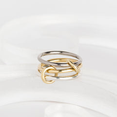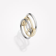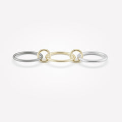 The Fauna linked ring is composed of three linked bands in 18k black gold, 18k yellow gold, and .925 sterling silver with 18k yellow gold connectors. Each Fauna linked ring is handmade in Los Angeles.