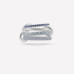 The Iris is constructed entirely from .925 sterling silver and features four luminous bands of pavé-set gemstones. Medium blue sapphires, aquamarine and tanzanite stones mirror the spectrum of blue tones found in cascades of iris petals. Tactile, orbiting connectors of solid .925 sterling silver link each band together, making the Iris perfect for wearing stacked or across multiple fingers. Each Iris is individually handmade in Los Angeles.
