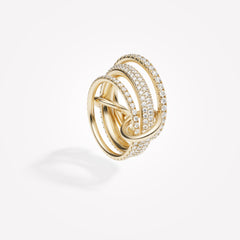 The Nova Rose is comprised of three linked rings in 18k rose gold, set with full cut pavé cognac, champagne, and white diamonds. The rings are joined by two connectors of 18k yellow gold.
