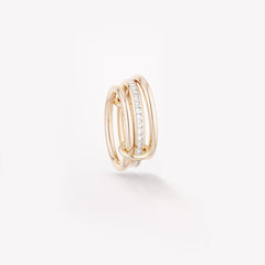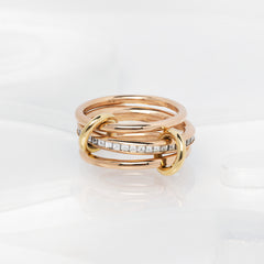 The Renè linked ring features a delicate profile and exquisite craft, with three linked bands of 18k rose gold, one of which has channel-set carré diamonds, held together by two 18k yellow gold connectors.