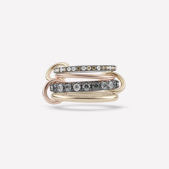 The Ziya MX V linked ring is comprised for four bands of 18k yellow gold and .925 sterling silver, with a mix of gray and white diamonds. Three orbiting connectors in matching 18k yellow gold allow the Ziya MX V linked ring to be worn spread across multiple fingers or stacked as a sculptural whole. Each Ziya MX V linked ring is handmade in Los Angeles.